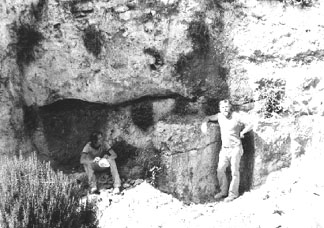 The Excavation BeginsIt was January, 1979 when Ron and the boys returned. Snow was on the ground. He now had to decide how and where to begin. The site he had pointed to was being used as a trash dump and appeared to hold very little promise to the human eye. It was located along this escarpment where the ground met the cliff-face. He had investigated the area adjacent to the escarpment and realized that the ground was raised to a much higher level today, which meant that the rock floor was many, many feet below the present ground level. In the past, Jerusalem has been destroyed many, many times. And the customary method of rebuilding these ancient cities was to simply build on top of the destruction level. Today, the debris is removed before rebuilding, but not so back then. This is why archaeologists are able to find evidences of many cities which have existed on the same site - they simply excavate through each successive level down to the next until they reach bedrock - which indicates that they have reached the first city to be established on that particular site. The site Ron was to excavate had a ground level many feet higher than the quarry floor to the south before the city wall. So, he and the boys could do nothing but begin to dig straight down. The original location that he had pointed to in 1978 contained an extremely large boulder just barely exposed above the surface, and Ron decided to begin digging several yards to the right. It was to be a job of mammoth proportions - these three, Ron, Danny and Ronny, would eventually remove many tons of rock and debris, having to sift through all of it for any artifacts. This was a requirement of the Department of Antiquities which they would always comply with. Their First "Discovery"So, they dug straight down along the cliff face, forming a steep wall with the earth they removed. Almost immediately, Ron noticed a "shelf-like" niche cut into the face of the cliff. Digging down further, he discovered there were three of these "niches" cut into the face of the cliff with a smaller one on the right side.