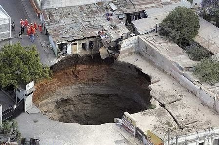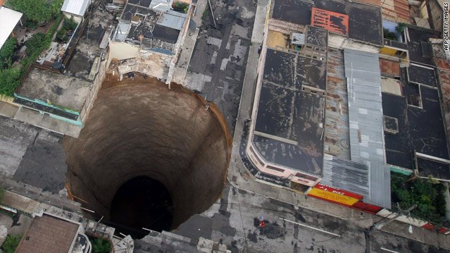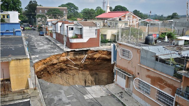 (CNN) -- Residents of a center-city neighborhood in Guatemala City, Guatemala, are still in shock after a massive sinkhole opened last weekend, gobbling several buildings and nearly an entire intersection, according to local officials. Over the weekend, the nearly perfect cylindrical crater developed and consumed whatever was on its surface, including structures and utility lines. There were no reports of deaths related to the sinkhole. The sinkhole's destruction added to the tragic events in Central America related to Tropical Storm Agatha, which left a death toll of more than 175 people in the region that includes Guatemala, Honduras and El Salvador. The 20-meter (about 66 feet) diameter sinkhole is about 30 meters (about 100 feet) deep. Guatemala City's human rights ombudsman, Sergio Morales, confirmed reports that since 2005, residents in the area had complained of rumblings, fissures and sinking terrain. "Yes, we can attest that they have been complaining since 2005 and we are looking into the initial complaints, " said Morales. "We are looking into the original response by municipal authorities," he said. In an interview with the newspaper Prensa Libre, neighborhood association president Augusto Lopez Rincon said he believed that excessive traffic caused by commercial trucks was to blame for the sinkhole. Another report A big, scary hole - A frightening image appeared on the photo sharing site Flickr.com of a sinkhole in Guatemala City that several on Twitter are calling the sinkhole to "hell." Tropical Storm Agatha drenched the region, resulting in the deaths of nearly 150 people in Guatemala, Honduras and El Salvador. In Guatemala alone, 90 people are missing, officials said. The country is suffering even more because the Pacaya volcano, which erupted Thursday night, has continued to spew ash. Three people were killed when they were crushed by rocks strewn by the volcano. |