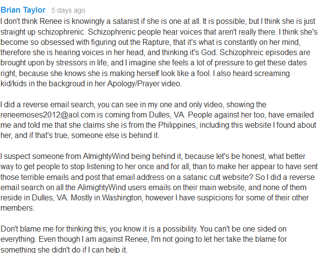 Renee Moses Exposes Her True Spirit and Fruit Renee Moses is a Satanist, Read the Proof Evidence Renee Moses has a legion of demons! UPDATE: February 3, 2014 Looks like our Lord YAHUSHUA was right about the rapture and Renee's lord was wrong again. We even gave Renee the 'benefit of the doubt' and waited at least 1 week past her rapture date, and it looks like she is still here on earth because she posted another video today. We were also waiting to see if she would repent of her false date setting for the rapture and as expected, she hasn't repented. In her new video she said the obvious, the rapture has been delayed. She is not going to stop folks, what does that tell you? She is NOT repentant, in fact she got another piece to her puzzle on Jan. 24, this must be the fith time or so that she has gotten the final piece to her puzzle. She denies everything that has been exposed about her, but what choice does she have. She can NOT admit to the truth because she still has an assignment from hell and satan will not allow her to quit. YAHUSHUA has warned about this woman to show you her true fruit and this Ministries fruit. If you choose to continue to believe her and her lies that is your choice, but you shall continue to be disappointed and we pray that you do NOT lose your faith in YAHUSHUA and the true rapture. In her new video she again denies these emails were sent from her and she claims that the only place you will ever see anything from her is either on her website or her youtube channel. She says she does not have time to do anything but video's and update her website. She still insists that someone is impersonating her and she has never renounced her faith in Jesus. So what is she saying, she is saying that someone has been impersonating her on the five doves website for the last few years and this impersonator has fooled all the people on the five doves forum. This so-called impersonator says the exact same things Renee has on her website and, in fact, this impersonator has led people to Renee's websites over these years. If you don't believe us, then go to www.fivedoves.com and search Renee Moses and you will see 143 results with her name in them, articles either written by her or responding to her. She also uses the name Renee M, and if you search this name you will see 595 results with this name. These results were as of today, Feb. 3, we can only pray they leave them up on the website and don't cover for her and take them down. We can always use the wayback machine though if they try to protect her. According to Renee, this person is not her, it is an imposter. We encourage you to please go to www.fivedoves.com and search her name and read the articles from the so-called imposter and pray for discernment. Pray to see if Renee is telling everyone the truth. We have already done this, and WE KNOW, THAT WE KNOW, THAT WE KNOW, Renee Moses is LYING to everyone. The person on fivedoves website is Renee Moses and she HAS renounced her faith in Jesus when her rapture date did not come to pass in 2012, SHE IS A LIAR!!! She has had plenty of time to post on this website for several years now. SHE IS A LIAR!!! How can anyone believe a word she says anymore. She says this imposter is out to discredit her. NOBODY has to impersonate her to discredit her, she does that all by herself. Renee Moses discredits Renee Moses, what more can we say, we don't have to do anything but post what she says. There is also a fool named Brian Taylor commenting on several of the Renee Moses video's exposing her. He commented on several of the video's we did exposing Renee and said how good the video's were. Now I see he is saying that he believes Renee is Schizophrenic, and then says he suspects it is someone from this Ministry behind these emails. WHAT!!! I am starting to believe he is Schizophrenic, he is after one thing and that is to create doubt in people as to the truth. He says he has been in touch with Renee and she denies these emails and he believes her, then he says she is Schizophrenic. HOW IN THE WORLD CAN YOU BELIEVE ANYTHING A SCHIZOPHRENIC SAYS? Here is a snapshot of this fool's comments on youtube. I will say this, I will stand before YAHUSHUA/JESUS one day as to whether everything I have posted here is the truth, and Brian Taylor will also stand before YAHUSHUA one day as to what he is posting on youtube. I need not say anymore. So there ya go folks, this is what's happening in the Renee Moses saga. She will continue doing what she is doing, but she is being very careful now and just saying that this is what she believes and has quit saying a thus saith the Lord. She now believes the rapture will happen in the next couple months. YAHUSHUA says, THE RAPTURE OF HIS BRIDE WILL NOT BE IN THE NEXT 2 MONTHS OF 2014. You have been warned once again, we can only pray you believe YAHUSHUA and stop listening to Renee Moses if you believe anything she says. UPDATE: January 16, 2014 As predicted, how's that for a prediction, at least we got it right. Renee Moses is denying these emails are from her. She is claiming someone is impersonating her. What else can she do? Do you really think she would ever admit to this? Of course she won't and can't admit to this. If she did admit this, it would expose what these satanists are doing and it would WAKE UP millions of Christians to this truth. These satanists WILL NEVER tell you the truth. Believe me, her coven is very upset that this has come out in the open. So please do not be naive enough to believe her when she denies this, she has NO choice. Here is a copy of her explanation posted January 14 taken off one of her websites at, https://plus.google.com/108753594451309789143/posts. I just want to apologize to all of those who have made comments for the incredibly rude and disrespectful and disgusting link that you were sent by someone who is obviously trying to attack my character. I did not read the entire link and hope that none of you did either as I saw 