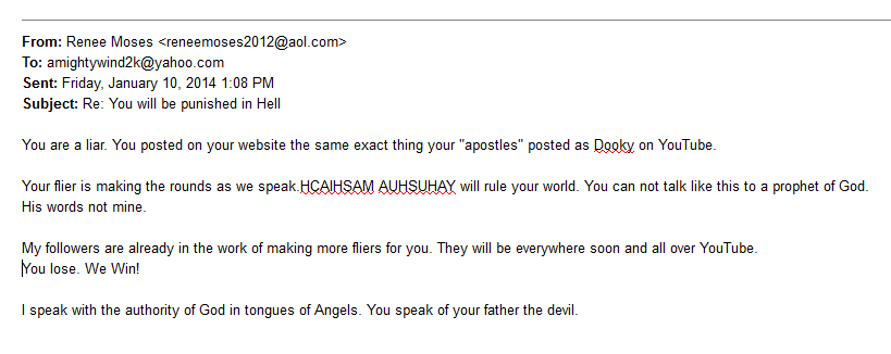 From Renee MosesTo Me Jan 10 at 1:08 PM You are a liar. You posted on your website the same exact thing your "apostles" posted as Dooky on YouTube. Your flier is making the rounds as we speak.HCAIHSAM AUHSUHAY will rule your world. You can not talk like this to a prophet of God. His words not mine. My followers are already in the work of making more fliers for you. They will be everywhere soon and all over YouTube. You lose. We Win! I speak with the authority of God in tongues of Angels. You speak of your father the devil. (Comment from Niko: Writing YAHUSHUA'S name backwards is a curse folks that satanists use) *******