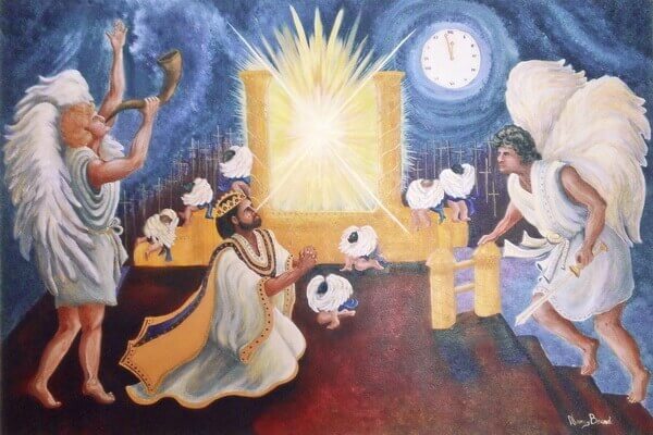 Ovo je vizija Nebesa u kojoj JAHUŠUA posreduje za izgubljene Ovce. Gavrilo duva u šofar6 rog, a Mihailo je izvukao svoj mač, spreman da povede anđeoske trupe u boj. Lice JAHVE-a, OCA, niko živ ne može videti. Hologramski krstovi iza trona, previše njih da bi se izbrojali, predstavljaju svakoga ko je prihvatio JAHUŠUA HA MAŠIAH-ov dar na Golgoti, jer je ON bio razapet na Krstu za svakoga od nas.