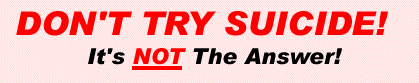 Le Seigneur a parlé et IL a dit "TU COMPARAITRAS DEVANT UN JEHOVAH EN COLERE!" C'est ce que j'ai dit a un Ex-Leader des Hell's Angels que j'avais rencontré à travers un ami qui avait été à l'hôpital avec un ami alors qu'il était à l'hôpital avec une sclérose en plaques sévère. Si la pensée vous vient même à l'esprit de vous suicider, souvenez-vous que votre vie ne vous appartient plus! Si vous avez accepté YAHUSHUA en tant que SEIGNEUR et SAUVEUR C'EST SA VIE MAINTENANT! SON ESPRIT SAINT VIT EN VOUS!