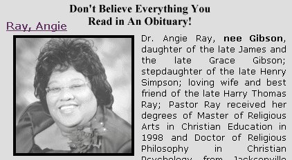 Many Victims Under Satanic Bondage? Emails From Current and Former Members of Her Church Substantiate These Suspicions! Are You One Seeking To Be Set Free? If So, You Are In Danger and Need To Be Set Free From The Bondage This Evil Woman Put You In! We Want To See You Set FREE! Please contact Elisabeth at Contact Us so she Can Pray For You! Pastor Angie Ray, a Goliath of an enemy, has died. Multitudes are writing and stating they were once a part of her congregation and, like them, we are asking if Angie Ray practiced Voodoo on the pretense of being Christian? Was she secretly a voodoo priestess? Why do I get the emails where people became demon possessed after joining her ministry or attending her church? Why did she have everyone chant, "The blood, the blood, the blood"? ___________________________________________________ THIS EMAIL FROM PIA EXPLAINS:And when I attended her church and said, "The blood of JESUS," she stopped the services to have the elders of the church rebuke me. I have proof that Angie Ray was having people pray for my death and quote those words in a prayer she told them to recite. What kind of minister tells their congregation to fast and pray for another pastor's death? There are those who claim to be Christians and even say the name of JESUS and yet they are mixing in voodoo, Satanism and witchcraft. Not once did she try and make peace. Instead she had her congregation fast and pray for my death...and I am told they are still fasting and praying for my death and the destruction of this ministry. As far as we are concerned, the deceased pastor Angie Ray is a Goliath that has fallen. And now her daughters are trying to silence me and say I am slandering her character. Yet I have read the lies she has told the people about me. People are writing and saying they feared her and the retaliation of others in the congregation and ask me not to post their names. To tell you the truth I am weary of cowards and so is YAHUSHUA! Even Bishops and Apostles write me and ask me not to post their names. Since when did YAHUSHUA'S warriors turn into wimps? __________________________________________________________________________________ __________________________________________________________________________________ Printable Text Version * * * * * * * * * * * * * * * * * * * *